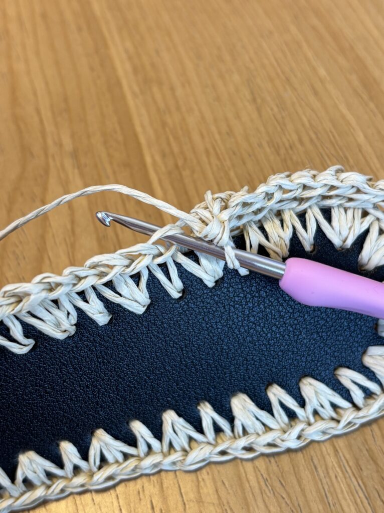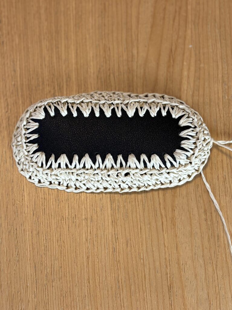 初めに、底板横の真ん中に針を入れ糸を出し、鎖編みします。