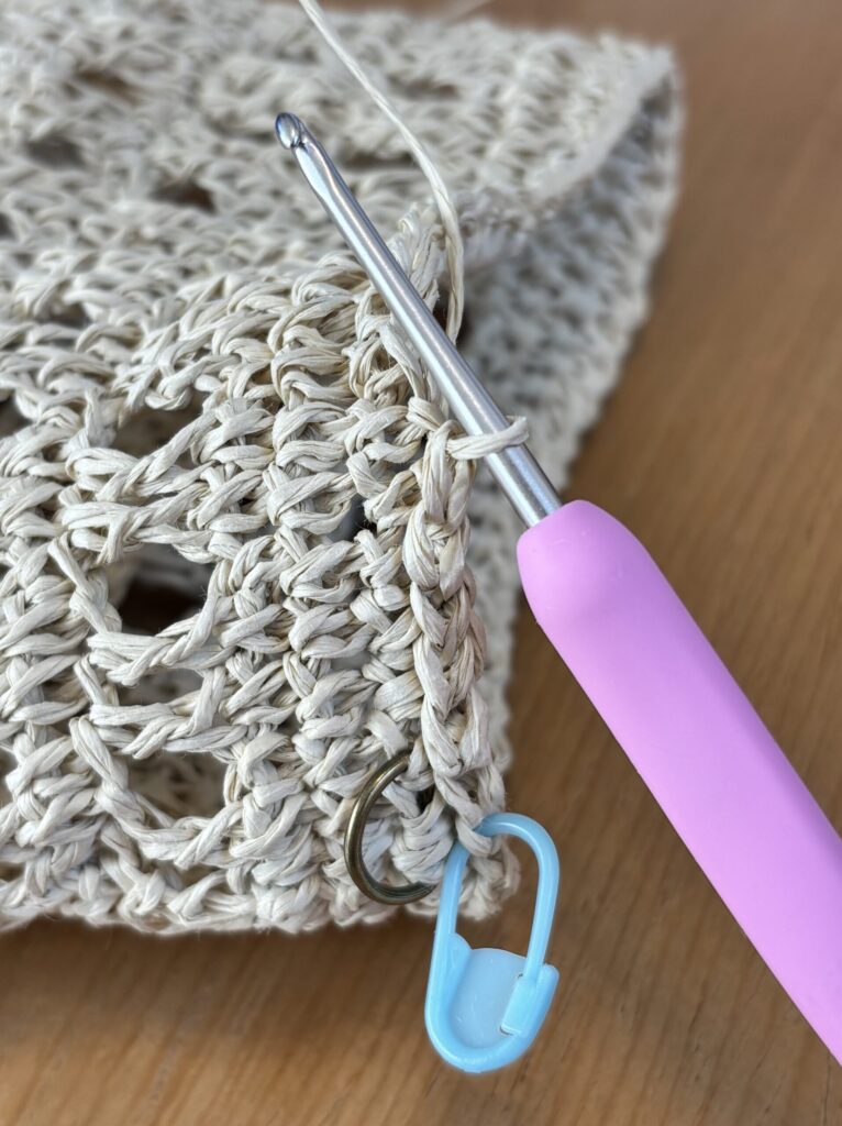 鎖編み、長編み、細編みでザクザクした模様ができます。