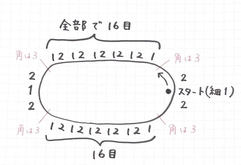 同じ目に細編みを1目編み、次の目は細編みを2目、角には細編みを3目…