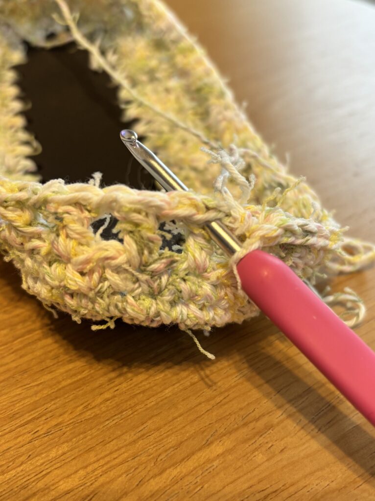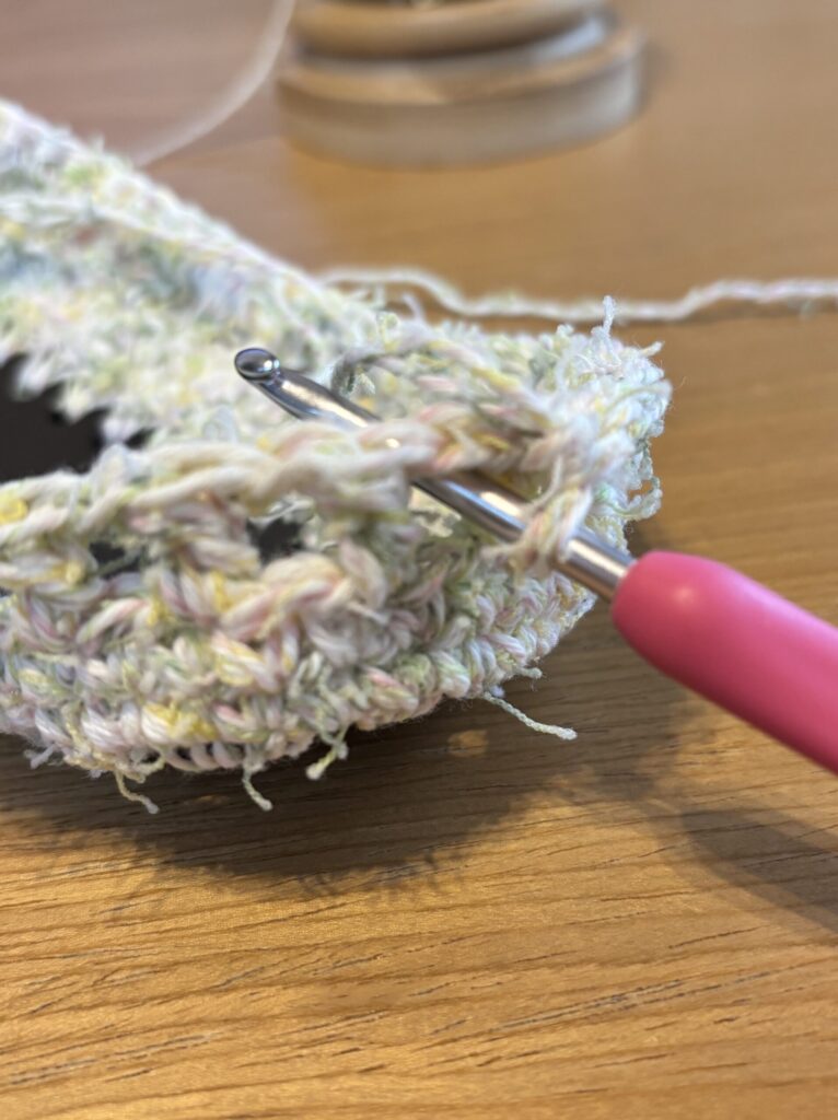 底板の穴に細編みを編みつけていきます。